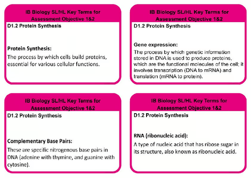 This resource is specifically designed for both IB Biology SL and HL students, focusing on the topic D1.2 DP BIOLOGY SL/HL PROTEIN SYNTHESIS KEY TERMS Assessment Objectives 1&2.