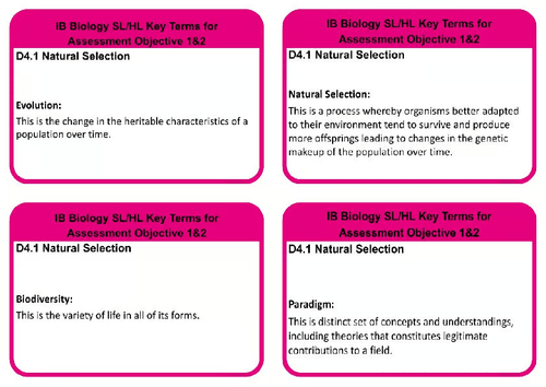 This resource is specifically designed for both IB Biology SL and HL students, focusing on the topic D4.1 NATURAL SELECTION. IB DP Biology Key Terms for Assessment Objectives 1&2.